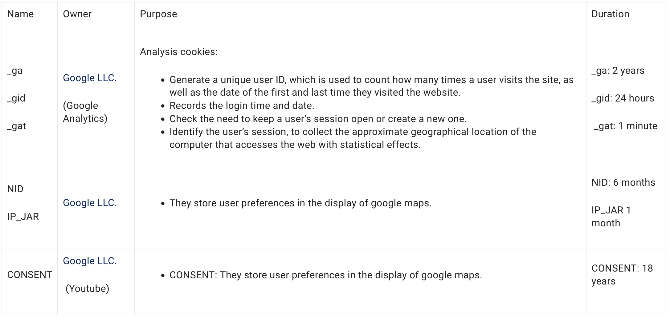 Specifically, the cookies used on our website are: